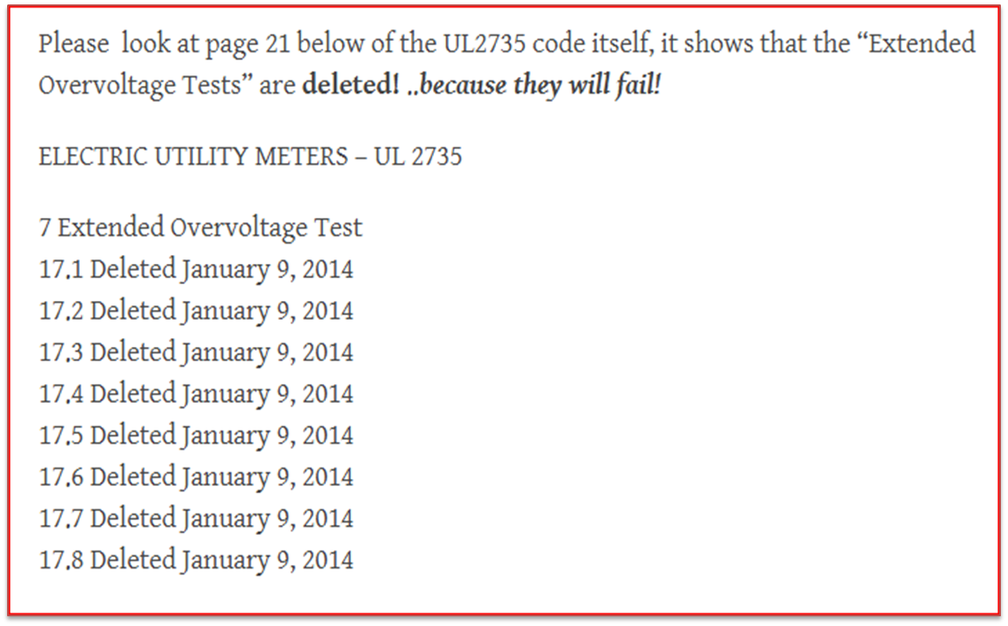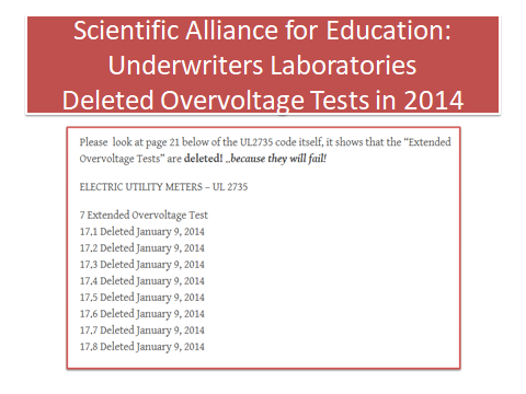 THE ELECTRONIC SMART METERS WILL NEVER PASS AN OVERVOLTAGE TEST! as of 2014, the spec sheets for smart meters only list UL2735…but they do NOT say UL2735 approved. And when you ask the Utility for their test results, they have nothing to show.